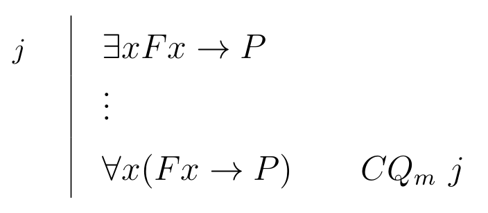 \begin{prooftree}\AxiomC{$ \exists x Fx \to P $} \RightLabel{\scriptsize{\(CQ_{m}\)}}\UnaryInfC{$ \forall x(Fx \to P) $}\end{prooftree} |