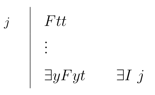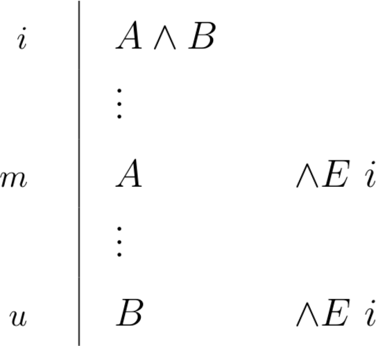 \begin{prooftree}\AxiomC{$ \exists x Fx $}\AxiomC{\scriptsize{$ i $}} \noLine \UnaryInfC{$ Fa $} \noLine \UnaryInfC{$ \vdots $} \noLine \UnaryInfC{$ G $} \RightLabel{\scriptsize{$ \exists E ~ i $}} \BinaryInfC{$ G $} \noLine\UnaryInfC{\(a\) = \textit{eigenvariable}}\end{prooftree} |