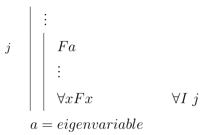\begin{prooftree}\AxiomC{$Fa$} \RightLabel{\scriptsize{$ \forall I $}}\UnaryInfC{$ \forall x Fx $}\noLine\UnaryInfC{\(a\) = \textit{eigenvariable}}\end{prooftree} |