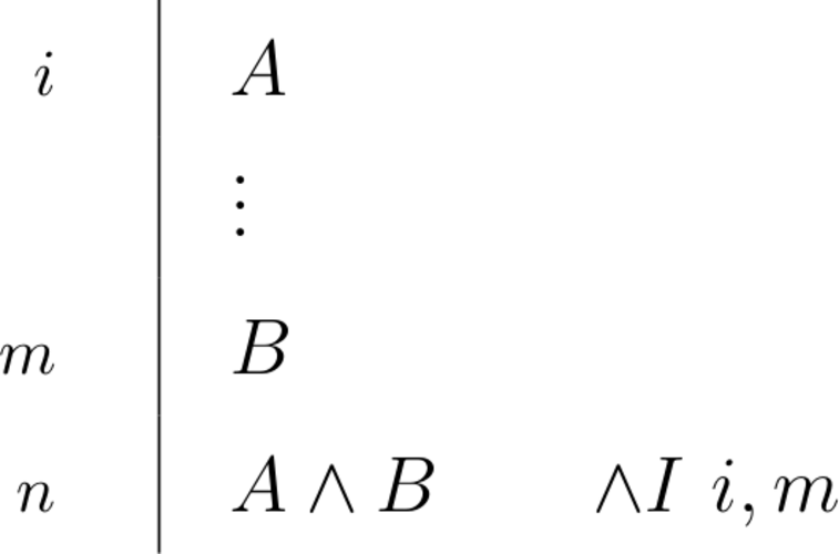 \begin{prooftree}\AxiomC{$A$}\AxiomC{$B$}\RightLabel{\scriptsize{$\land I$}}\BinaryInfC{$A \land B$}\end{prooftree} |