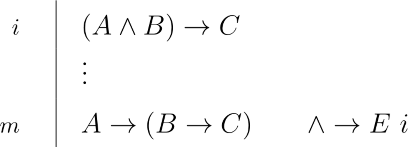 \begin{prooftree}\AxiomC{$(A \land B) \to C$}\RightLabel{\scriptsize{$\land\to E$}}\UnaryInfC{$A \to (B \to C)$}\end{prooftree} |
