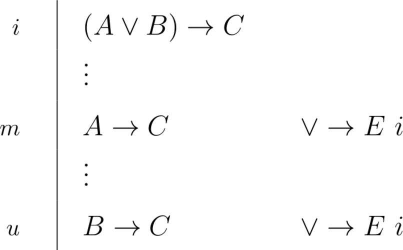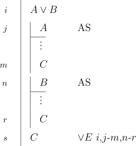 \begin{prooftree}\AxiomC{$A \lor B$}\AxiomC{\scriptsize{1}}\noLine\UnaryInfC{$A$}\noLine\UnaryInfC{$\vdots$}\noLine\UnaryInfC{$C$}\AxiomC{\scriptsize{2}}\noLine\UnaryInfC{$B$}\noLine\UnaryInfC{$\vdots$}\noLine\UnaryInfC{$C$}\RightLabel{\scriptsize{$\lor E$ 1,2}}\TrinaryInfC{$C$}\end{prooftree} |