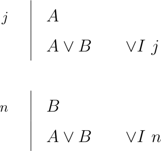 \begin{prooftree}\AxiomC{$A$}\RightLabel{\scriptsize{$\lor I$}}\UnaryInfC{$A \lor B$}\end{prooftree} \begin{prooftree}\AxiomC{$B$}\RightLabel{\scriptsize{$\lor I$}}\UnaryInfC{$A \lor B$}\end{prooftree} |