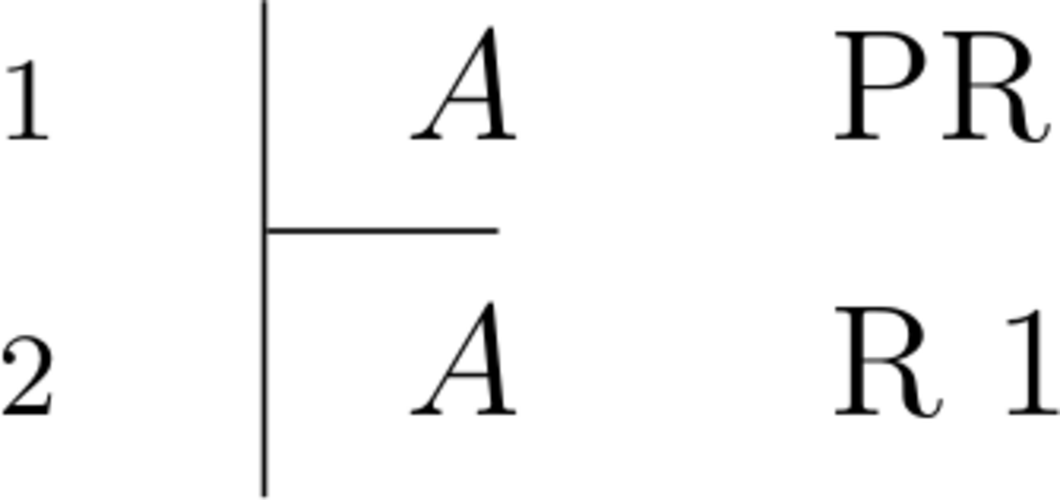 \begin{prooftree}\AxiomC{$A$}\RightLabel{\scriptsize{$R$}}\UnaryInfC{$A$} \end{prooftree} |
