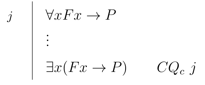| \begin{prooftree}\AxiomC{$ \exists x (Fx \to P), \Gamma \vdash D $}\RightLabel{\scriptsize{\(CQ_{c}\)}}\UnaryInfC{$\forall x Fx \to P, \Gamma \vdash D $}\end{prooftree} |
