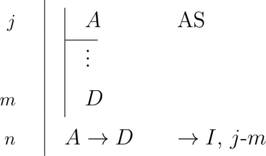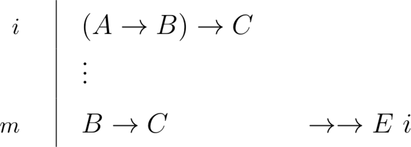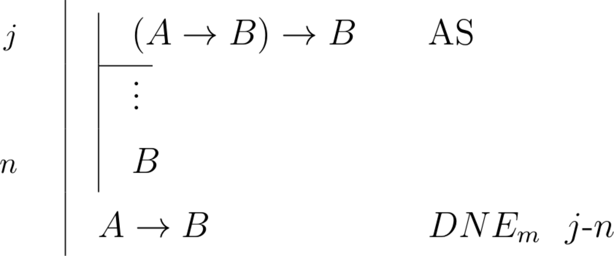 \begin{prooftree}\AxiomC{\scriptsize{$i$}}\noLine \UnaryInfC{$(A \to B) \to B$}\noLine\UnaryInfC{$\vdots$}\noLine\UnaryInfC{$B$}\RightLabel{\scriptsize{\(DNE_{m}\)}~\(i\)}\UnaryInfC{$A \to B$}\end{prooftree} |