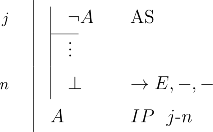 \begin{prooftree}\AxiomC{\scriptsize{1}}\noLine\UnaryInfC{$\lnot A$}\noLine\UnaryInfC{$\vdots$}\noLine\UnaryInfC{$\bot$}\RightLabel{\scriptsize{$IP$ 1}}\UnaryInfC{$A$}\end{prooftree} |
