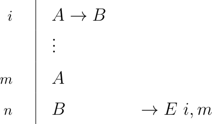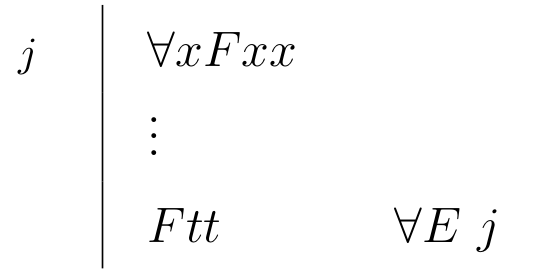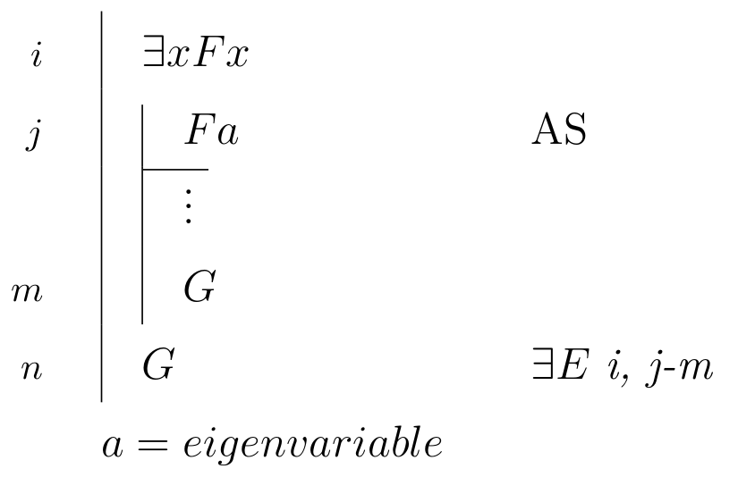 \begin{prooftree}\AxiomC{$ \exists x Fx $}\AxiomC{\scriptsize{$ i $}} \noLine \UnaryInfC{$ Fa $} \noLine \UnaryInfC{$ \vdots $} \noLine \UnaryInfC{$ G $} \RightLabel{\scriptsize{$ \exists E ~ i $}} \BinaryInfC{$ G $} \noLine\UnaryInfC{\(a\) = \textit{eigenvariable}}\end{prooftree} |